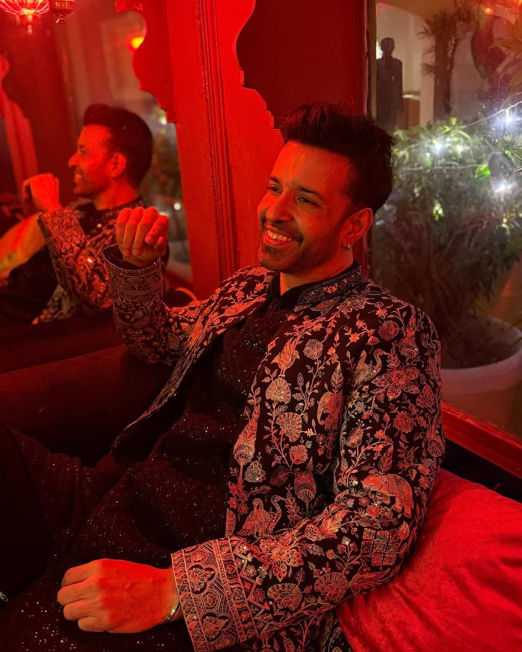 An elegant Indo-Western ensemble where detailed embroidery brings floral and nature-inspired motifs to life. The long sherwani, layered over an embroidered kurta, flows into straight trousers, creating a harmonious balance of regality and contemporary charm. Every stitch reflects artistry, making this outfit a refined choice for grand celebrations.