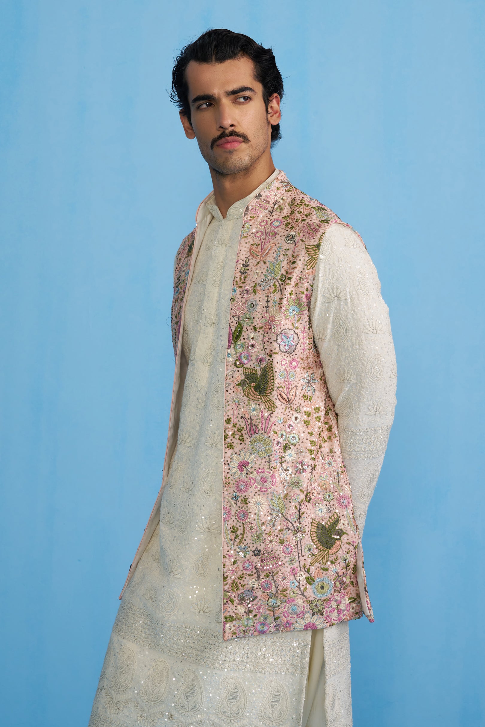 The outfit consists of a long kurta with an embroidered repeating pattern. The kurta is paired with trousers, which are wide at the top and gathered at the ankles, creating a pleated, draped effect. Over the kurta, a short, sleeveless jacket is worn, adorned with floral embroidery.